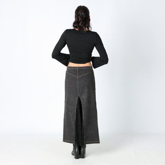 Charcoal Grey 90s Made in Italy Denim Maxi Skirt Lace Detail Contrast Stitch Sparkle (S)