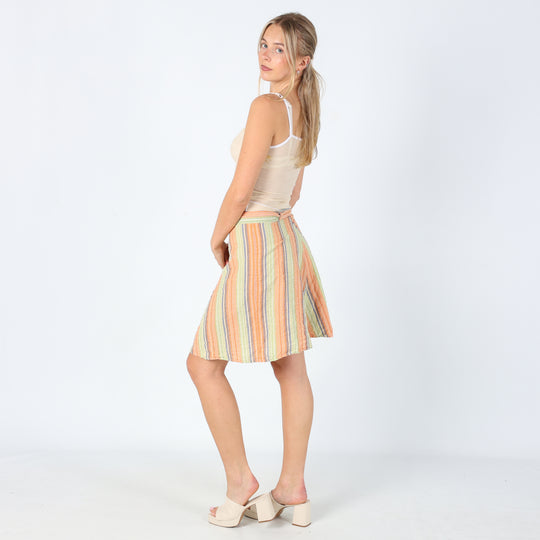 Multi Colured 90s Controcorrente Woven Midi Skirt Adjustable Striped Wrap Around Linen (M)