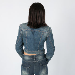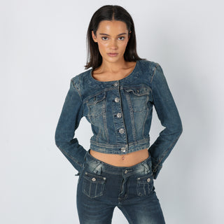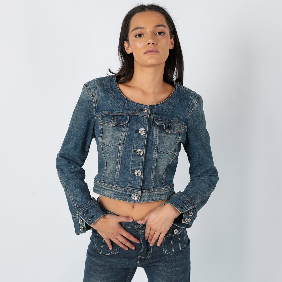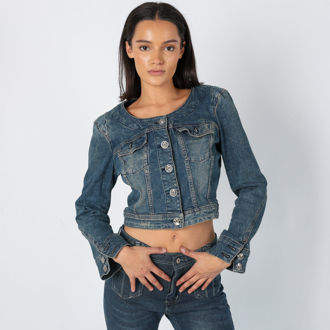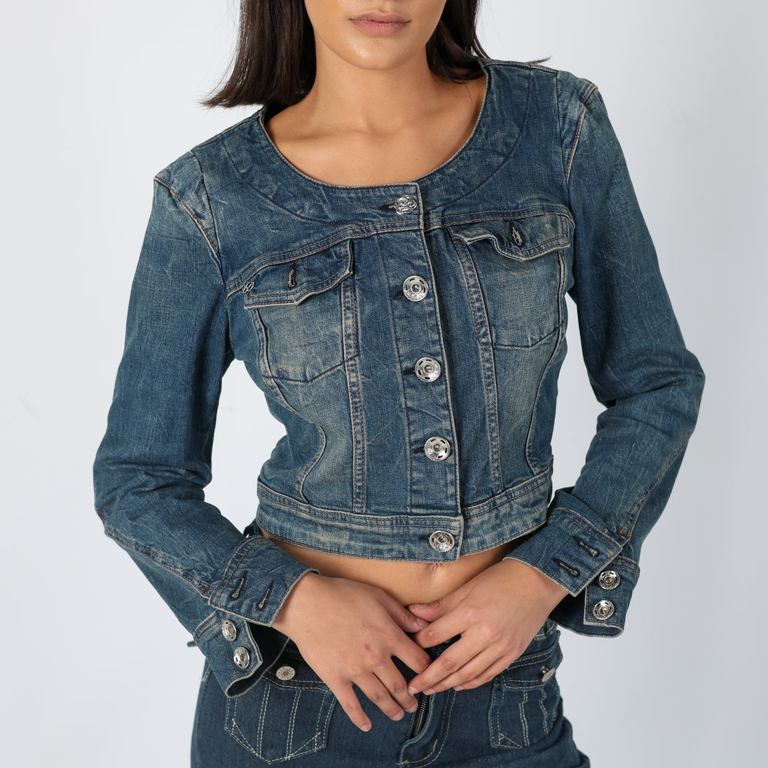 Navy Blue 90s Miss Sixty Denim Jacket Low Scoop Unique Chic Floral Button (M)