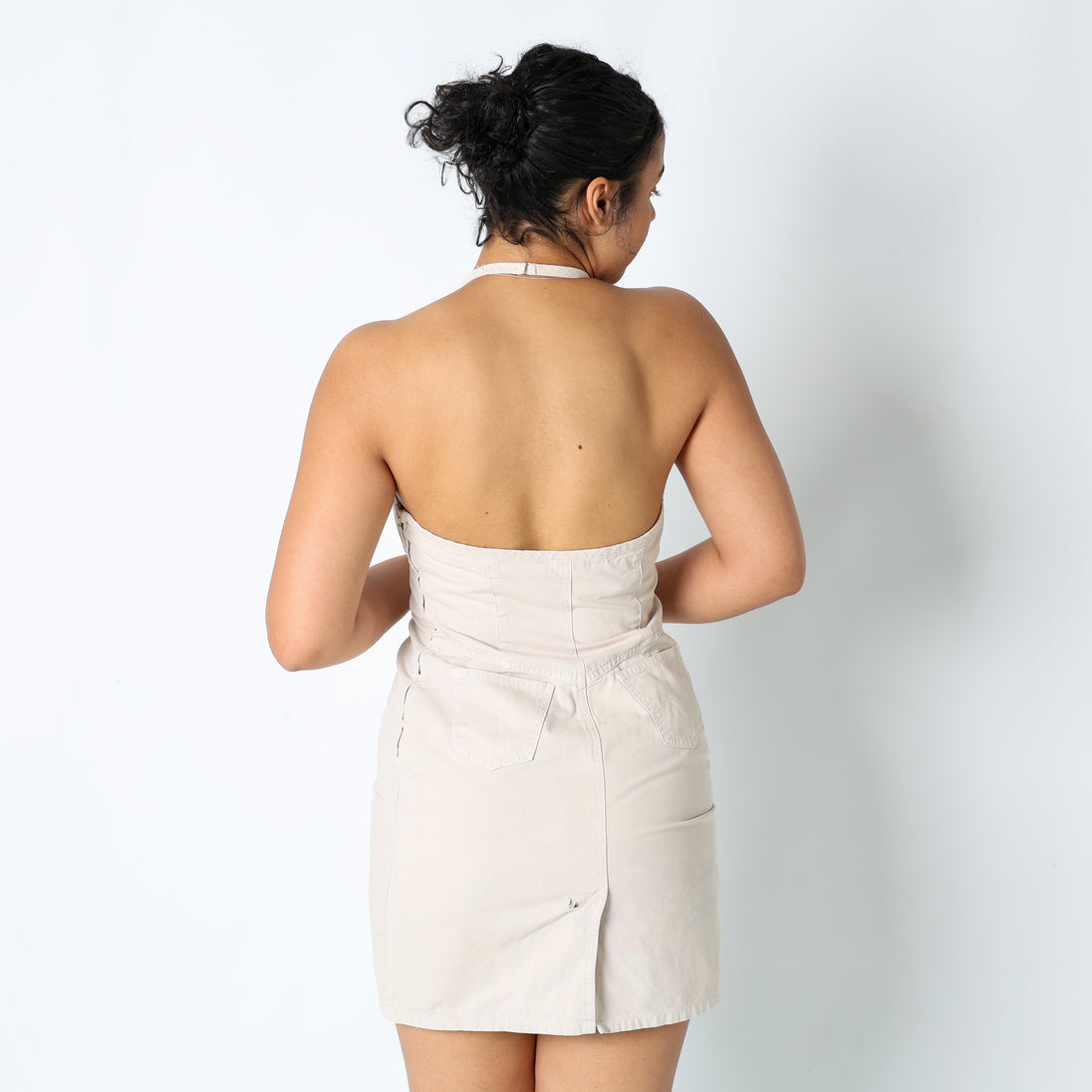 Beige 90s United Colours of Benetton Woven Midi Skirt Split Hem Halter Neck (M)