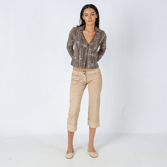 Tan 90s Cop Copine Capri Trouser Floral Embroidered (S)