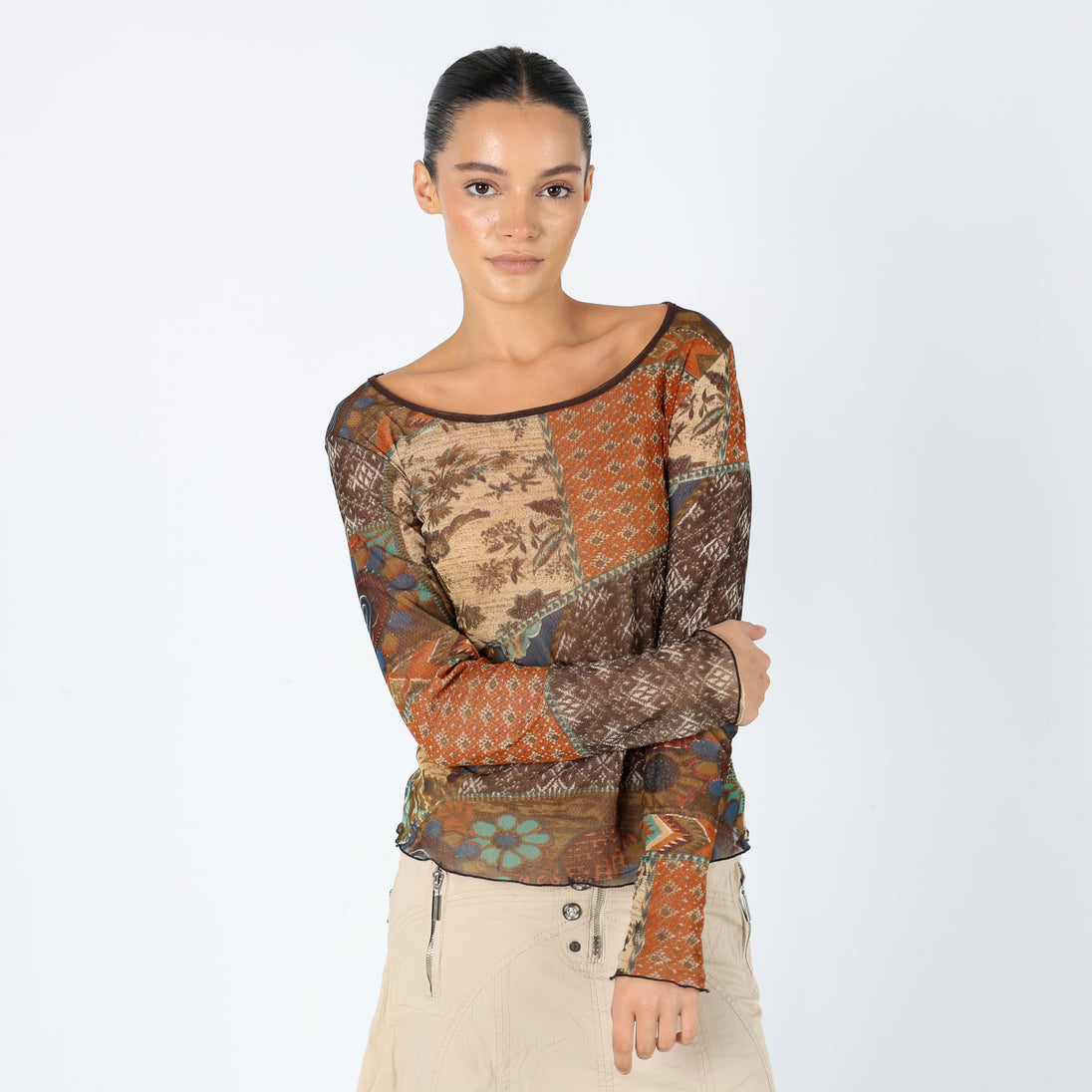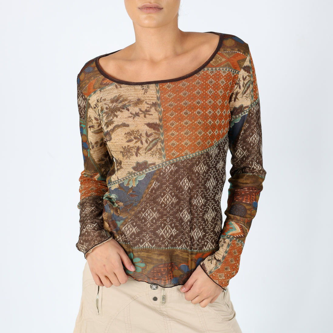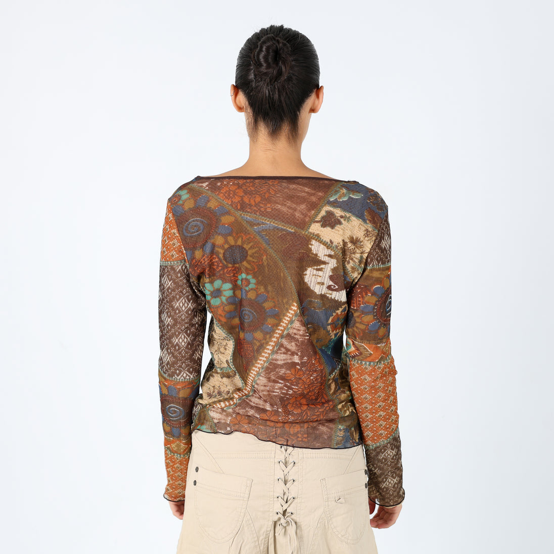 Brown 90s Marsutta Mesh Top Sheer Pattern Long Sleeve (M)