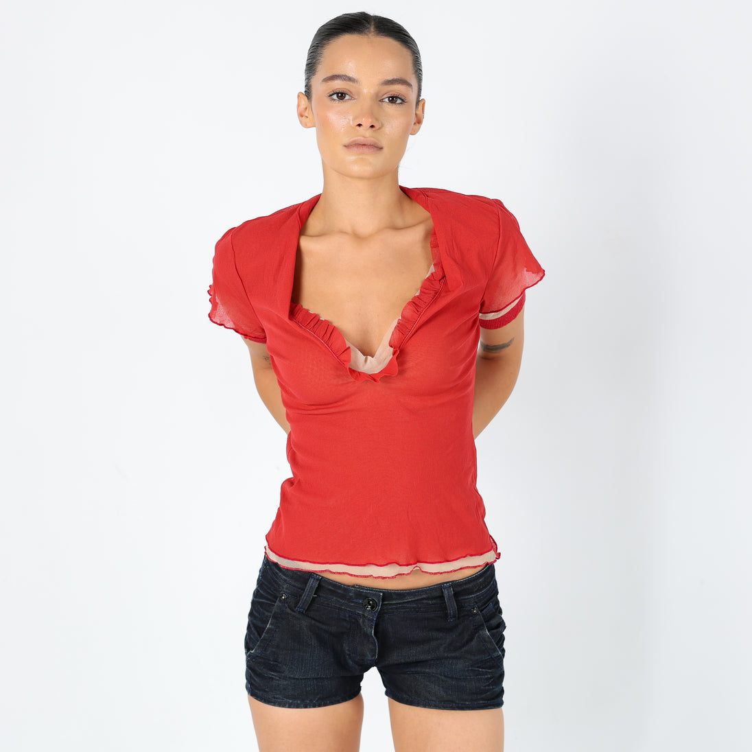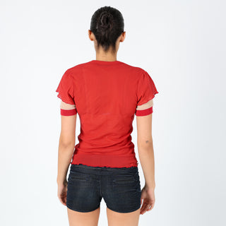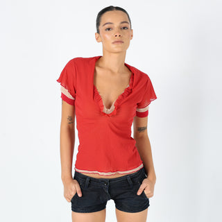 Red 90s Juta age Mesh Top Sheer V Neck (M)