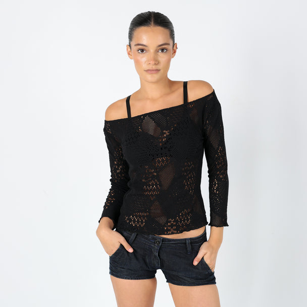 Brown 90s Vera Moda Mesh Top Sheer Off Shoulder Lace Detail (M)