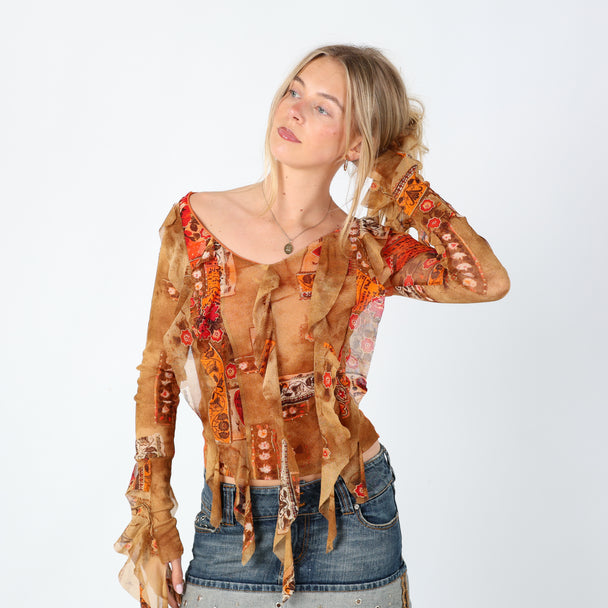 Orange 90s Stand Point Cami Sheer Frilled Patterned (M)