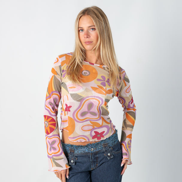 Tan 90s bagarry Mesh Top 90s Printed, Girls Night Out, Gem Detail (M)