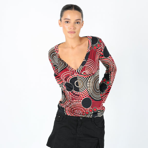 Red 90s Juta age Mesh Top Sheer V Neck (M)