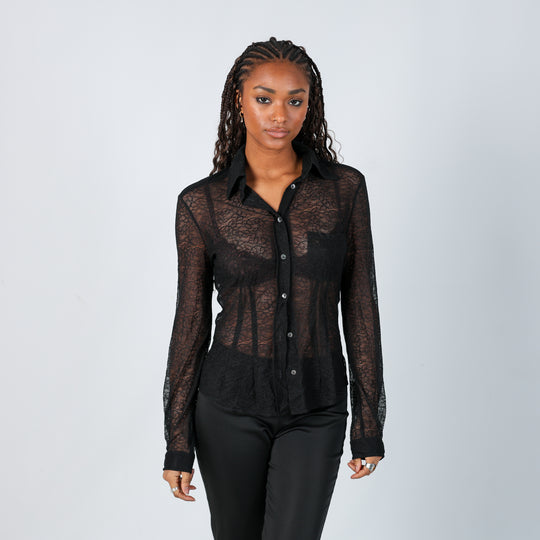Black y2ks Save The Queen Mesh Top Sheer Lace Sexy Chic (S)
