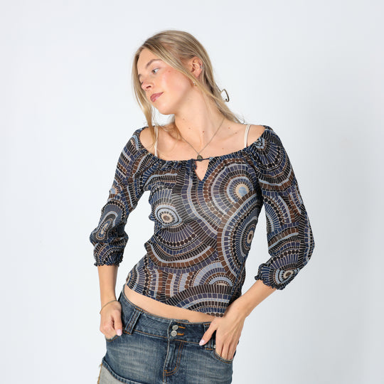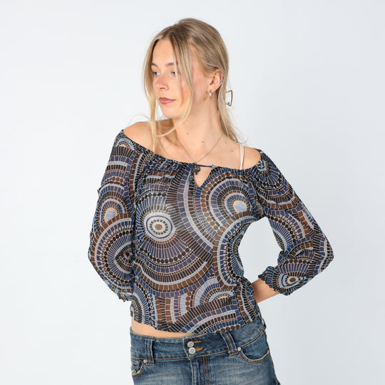 Turquoise 90s Blasting Mesh Top Unique Sheer Animal Print Sequin Detailing (S)
