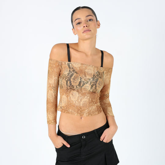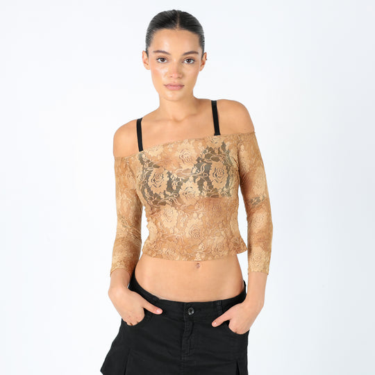 Tan 90s Unbranded Mesh Top Off Shoulder Sheer Floral (6)