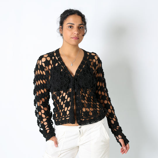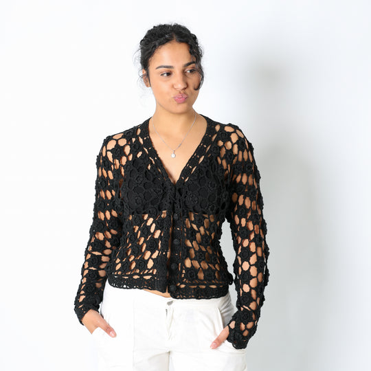 Black y2ks Blue Note Woven Top Crochet Cardigan (L)